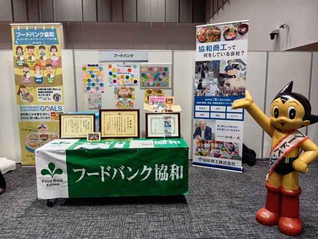 ④フードバンク協和のコーナーも入り口前にマスコットの鉄腕アトム君と一緒に来場者をお迎え致しました。