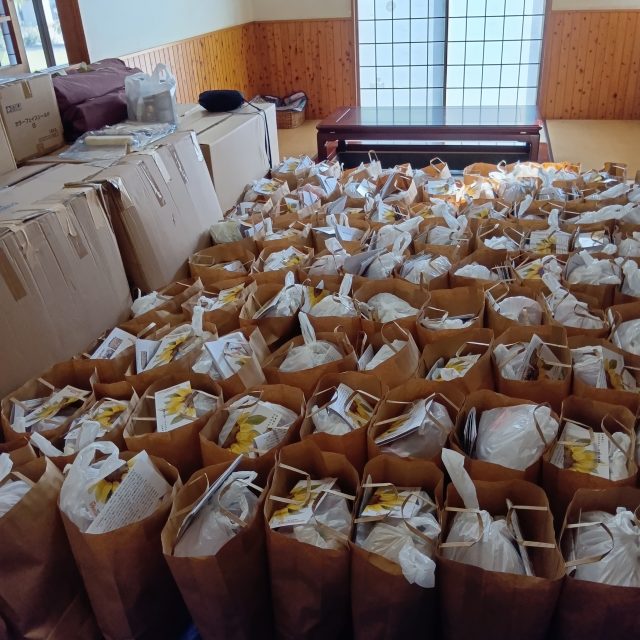③詰め合わせセット100袋を準備し明日100世帯の来場者へ支援提供致します。
