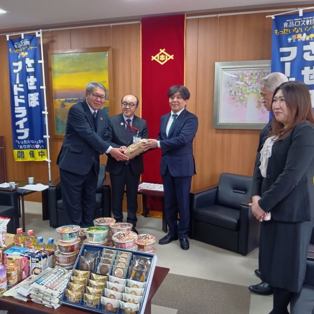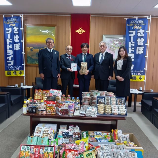 ①佐世保市西本副市長様・長崎経済同友会山口代表幹事様・第一生命保険㈱箱崎佐世保支社長様・佐世保ロータリークラブ会長兼㈱あおき青木社長様と一緒にフードバンク協和の加城代表理事も。